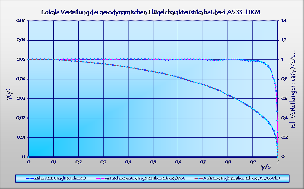Bei nahezu elliptischer Flächenform wie bei der AS 33 liegt der Auftriebsmittelpunkt einer Flächenhälfte bei etwa 40 - 45 % der Halbspannweite und die entsprechende Flächentiefe ist der Wert, mit dessen Hilfe für jeden Auftriebsbeiwert cL des Profilstraks die Fluggeschwindigkeit V, die zugehörige Re-Zahl und der Widerstandsbeiwert cD des Modells theoretisch bestimmt werden können. Für das AS 33-HKM-Modell ist diese Flächentiefe ld ≈ 255 mm.