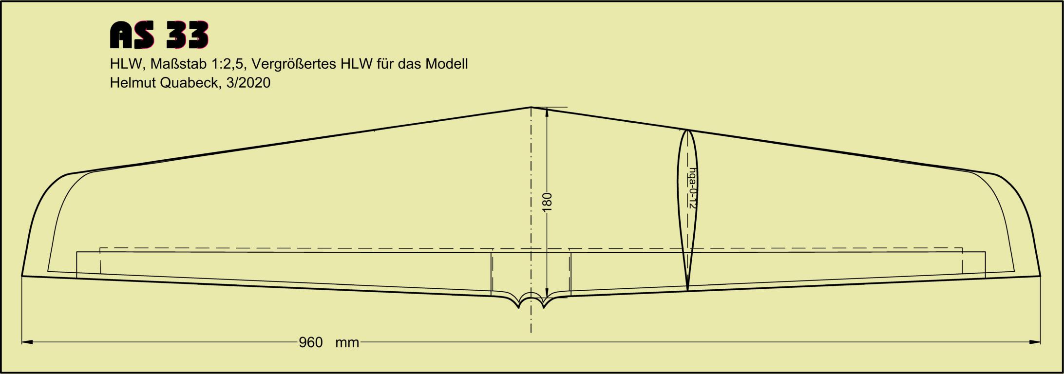 schaffen. Das Seitenleitwerk wurde für das ASW 28-Modell seinerzeit etwas vergrößert, weil im Modellflug oftmals engere Wenden und Kreise geflogen werden und dabei größere negative Wendemomente an der Tragfläche entstehen als beim Original, die durch höhere Luftkräfte mittels Ruderausschlag am Seitenleitwerk kompensiert werden müssen. Da die AS 33-HKM eine deutlich höhere Streckung (L = 32,4) als das ASW 28-Modell (L = 27,2) hat und somit im agilen Kurvenflug höhere negative Roll-Wende-Momente zu erwarten sind, wird die AS 33-HKM dasselbe leicht vergrößerte Seitenleitwerk bekommen. In der 3-Seitenansicht oben entsprechen die