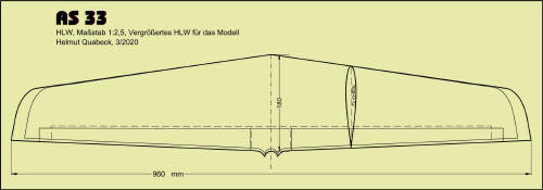 AS 33-Originalseglers ließ vermuten, dass die geringe Größe des Höhenleitwerks für ein stabiles Fliegen eines Modells im Maßstab 1:2,5 nicht ausreichen würde. Man darf dabei nicht vergessen, dass beim Original die Flächentiefen 2,5 x größer sind und die Mindestgeschwindigkeit etwa doppelt so hoch ist. Daraus ergeben sich für die Strömung am Höhenleitwerk des Originalseglers etwa fünf Mal größere Re-Zahlen, womit größere Umfänge der