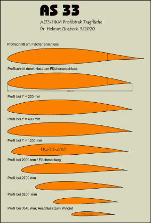 Das Profil HQ/DS-2/10 wurde vor allem für die AS 33-HKM gewählt, weil mit negativem Ausschlag der Klappen und Ruder bis zu ca. -4° das Profil fast eine symmetrische Form annimmt und die Polaren sich derart zu niedrigeren Auftriebsbeiwerten verschieben, dass bei Nullauftrieb etwa der geringste Profilwiderstand entsteht. Mit dem Eppler Programm PROFIL06 errechnet sich ein minimaler Profilwiderstand von cwp ≤ 0,005, ohne Klappen