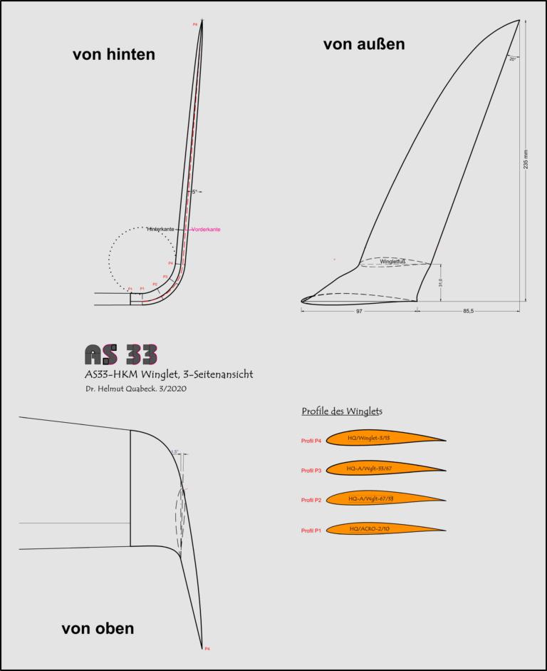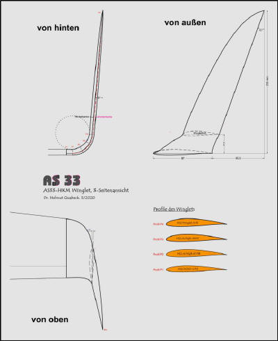 Die nebenstehende Grafik zeigt die Ansicht des Winglets für die AS 33-HKM von 3 Seiten, von hinten, von außen und von oben. Das Design von Form und Dimensionen der Winglets gestaltete sich deshalb als ziemlich kompliziert, weil dies nur anhand der zur Verfügung stehenden dürftigen Grafiken des AS 33-Originals und von Fotos nachvollzogen werden konnte.