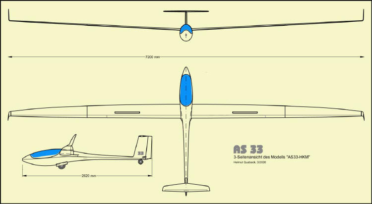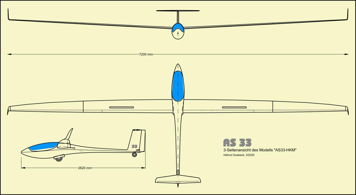 hier schon mal vorab über meine theoretischen konstruktiven Vorstellungen vom Bau einer AS 33 im Maßstab 1:2,5 zum Original vorstellen. Ich nehme an, dass dies sicher einige Freunde der Großsegler interessieren wird. Das Modell wird im Weiteren als „AS 33-HKM“ bezeichnet. Im September wird es übrigens vom VTH eine Sonderausgabe der FMT übler Segelflugmodelle geben, darin wird auch ein ausführlicher Essay von mir über das Thema