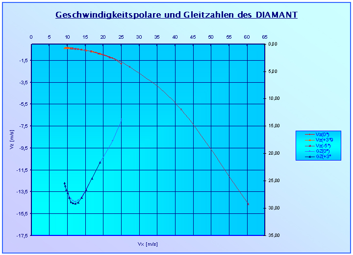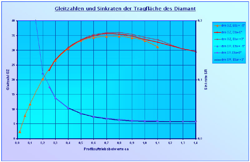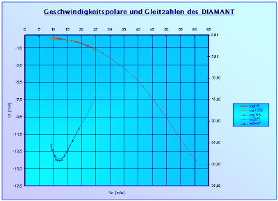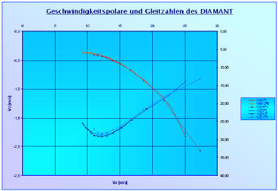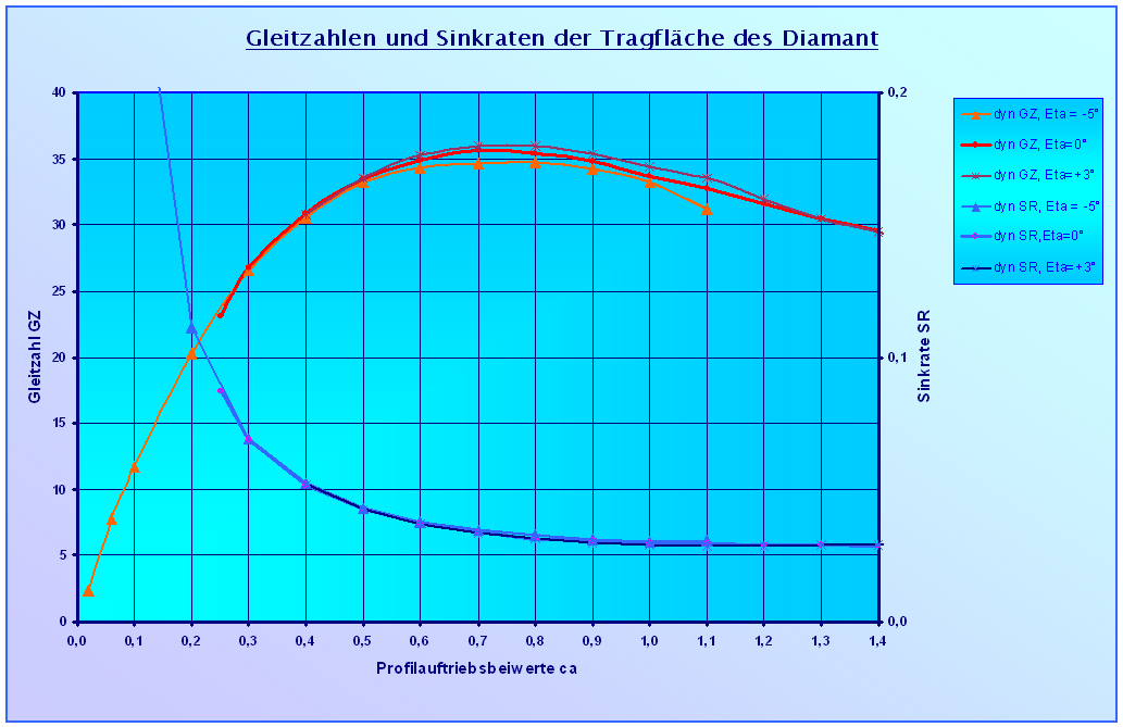 Schwerpunkt (s. u.) für unseren Diamant Plus wählten wir für für den Arbeitspunkt cA = 1,09, bei dem die Sinkrate für alle praktisch relevanten