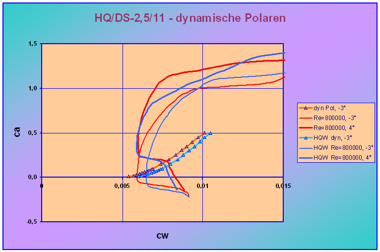 Polaren der HQ/DS-2,25/...-Profile: Im Gegensatz zu allen anderen Polaren, die unter "Profilkoordinaten und Polaren" bisher (Dezember 2009) für die HQ-Profile gezeigt wurden, wurde für diese Profilserie zur Polarenberechnung erstmals die neueste Version des Profildesign- und Analyseprogramms "PROFIL06" von Prof. Dr. Richard Eppler (von 2007) verwendet. Dieses Programm berücksichtigt neuere praktische und theoretische wissenschaftliche Erkenntnisse bezüglich der Grenzschichtströmung, vor allem solche der viskosen Strömungseffekte beim Übergang von laminarer zu turbulenter Strömung sowie der Bildung von Ablöseblasen, und die Verbesserungen der Squire-Young-Formel zu Widerstandsberechnung. Wegen der großen Fülle der interessierenden Auswertungen mit dem PROFIL06-Programm wurden die Ergebnisse in einer PDF-Datei zum Herunterladen zusammengefasst: |